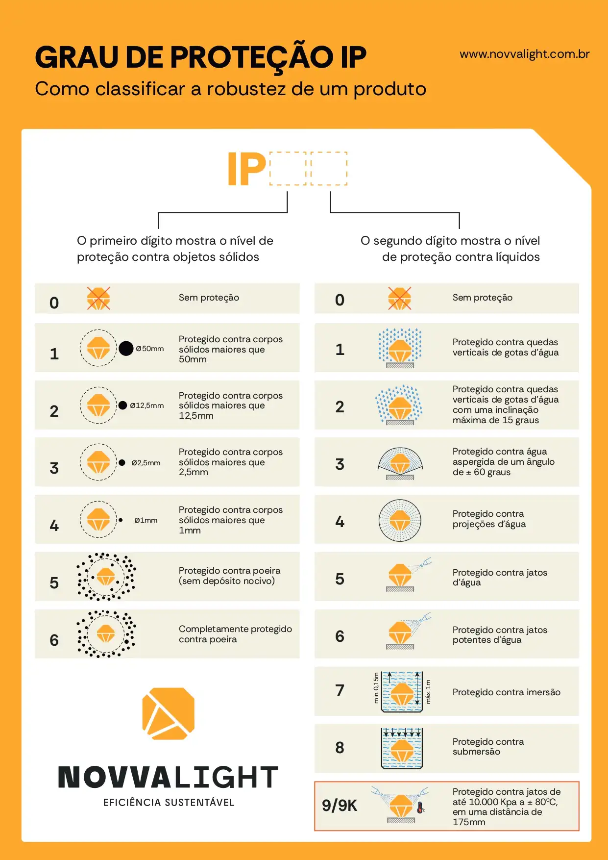 Portanto, quanto maior for o número, maior a resistência à água e poeira, reduzindo falhas e aumentando a durabilidade de refletores. Abaixo, confira a tabela com os graus de proteção: